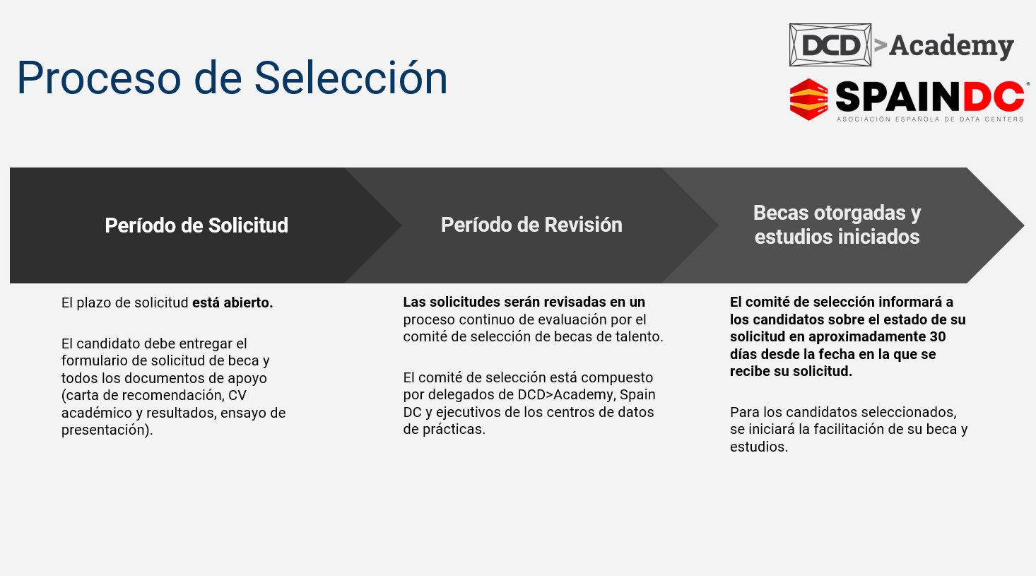 Todas las becas también incluyen la oportunidad de hacer prácticas remuneradas en data centers de colocation asociadas con Spain DC.