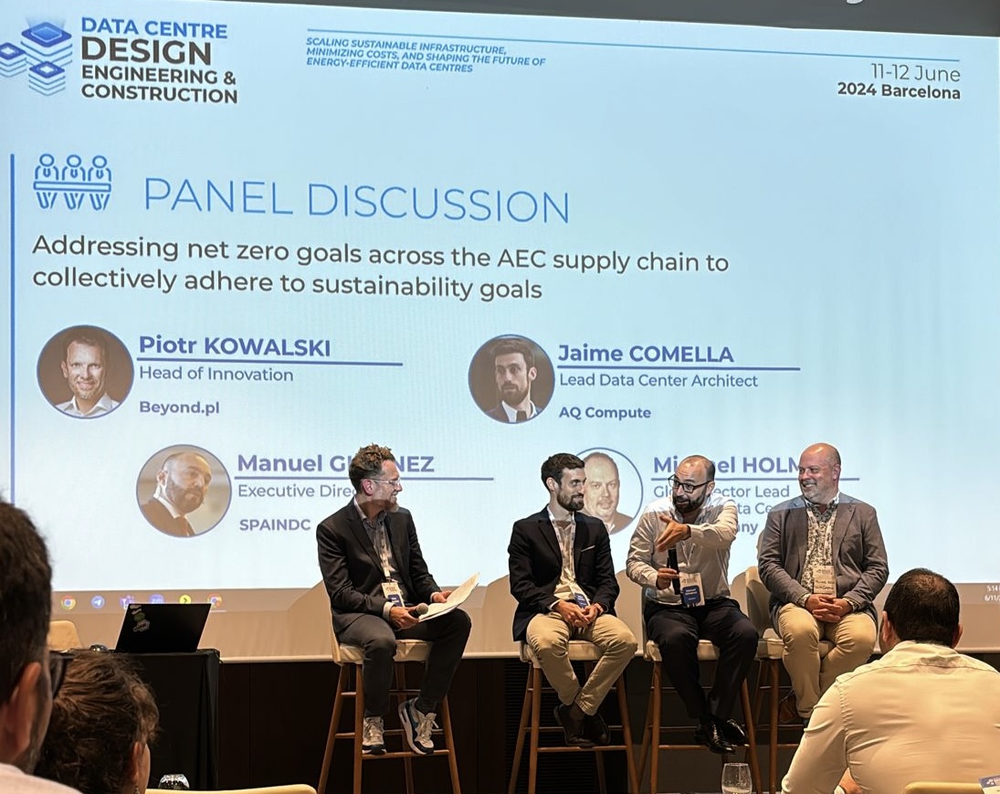 Manuel Giménez, director ejecutivo de Spain DC, ha intervenido en la mesa redonda “Addressing net zero goals across the AEC supply chain to collectively adhere to sustainability goals” junto a Piotr Kowalski, Head of Innovation de Beyond.pl; Jaime Comella, Lead Data Center Architect de AQ Compute; y Michael Holm, Global Sector Lead Helsinki Data Center de Telia. En el panel, Giménez ha hecho hincapié en la importancia de cumplir con la meta de cero emisiones dentro de los objetivos de sostenibilidad.